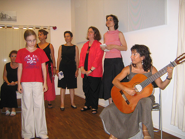 Questi canti sono riproposti con arrangiamenti originali che lei compone per una, due e più voci, per un iniziazione alla polifonia. La lezione comincia con esercizi fisici di riscaldamento e di rilassamento, per togliere le tensioni muscolari. Poi si eseguono esercizi di respirazione, al fine di prendere coscienza della respirazione diaframmatica e riscaldamento vocale.